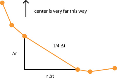 How much can she increase r, if she is travelling a total of ¼ Δt, and needs only to go around a distance of r Δt? It is well worth learning how to think like an 18th Century Mathematician: essentially we have a right triangle, and can use the Pythagorean Theorem. (We don’t really have exactly a right triangle, but the difference is negligible, and as Δt decreases, is less and less important, until irrelevant in the limit.)