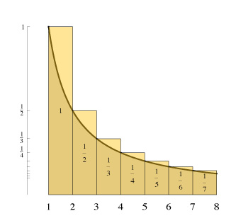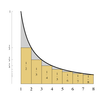 Now the area of a box 1 unit wide and 1/n units tall is 1/n, and boxes of width 1 and heights 1, 1/2, 1/3, . . . altogether have area 1 + 1/2 + 1/3 . . .