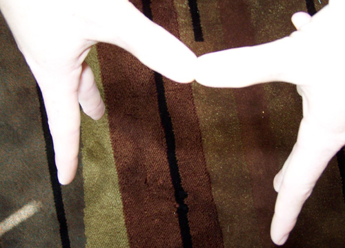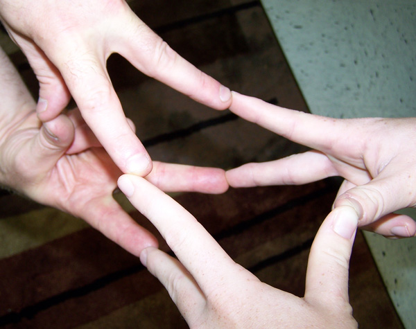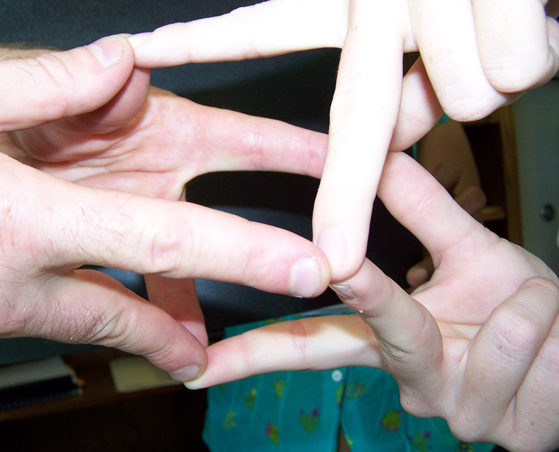In the podcast, we had a little difficulty describing some of the ways of holding your hands. In the first trick, two people each make a swing set like so:
